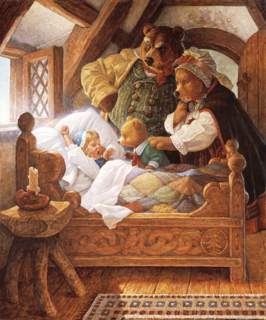 There are many versions and revisions of this classic fairy tale. The protagonist was originally a cantankerous, old woman who, in Eleanor Mure’s 1831 story, intrudes on the home of three bachelor bears. Upon discovering her antics, the three bears deal with her fairly violently first trying to burn and then to drown her. Unsuccessful in these attempts, they instead “chuck her aloft on St. Paul’s church-yard steeple.”
